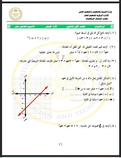أسئلة تقييم الأسبوع الـ 15 الرياضيات أولى ثانوي