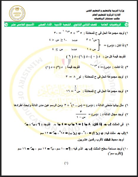 أسئلة تقييم الأسبوع الـ 15 الرياضيات العامة ثانية ثانوي
