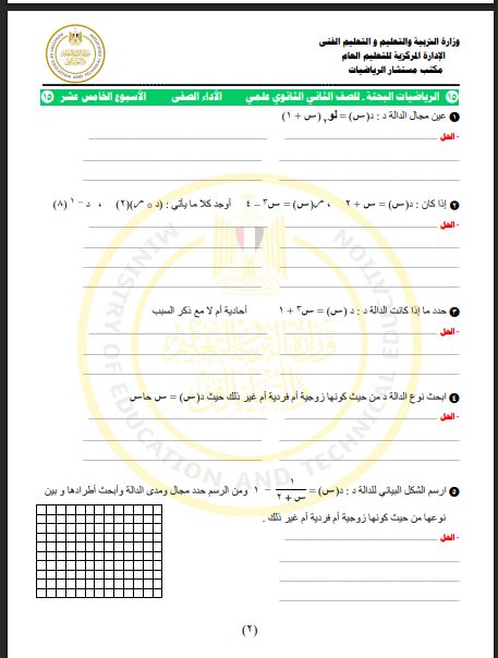 أسئلة تقييم الأسبوع الـ 15 الرياضيات البحتة ثانية ثانوي