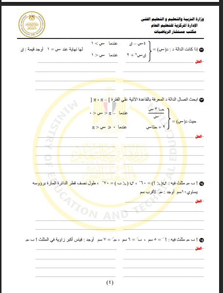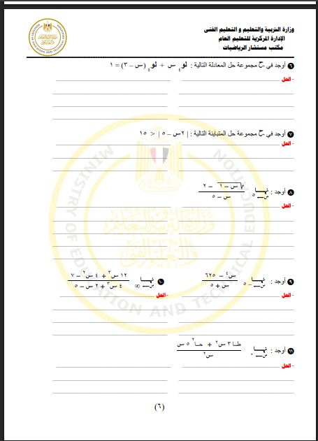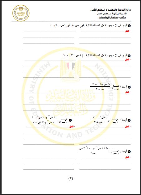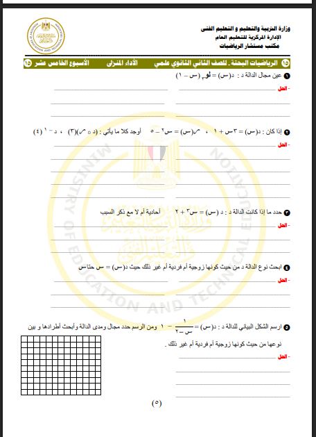 مراجعات نهائية أسئلة تقييم الأسبوع الـ 15 الرياضيات البحتة