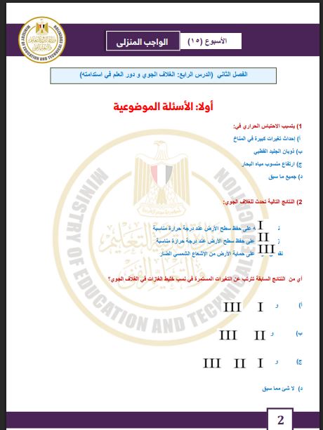 اسئلة تقييم الأسبوع الـ 15 لـ العلوم المتكاملة ترم أول