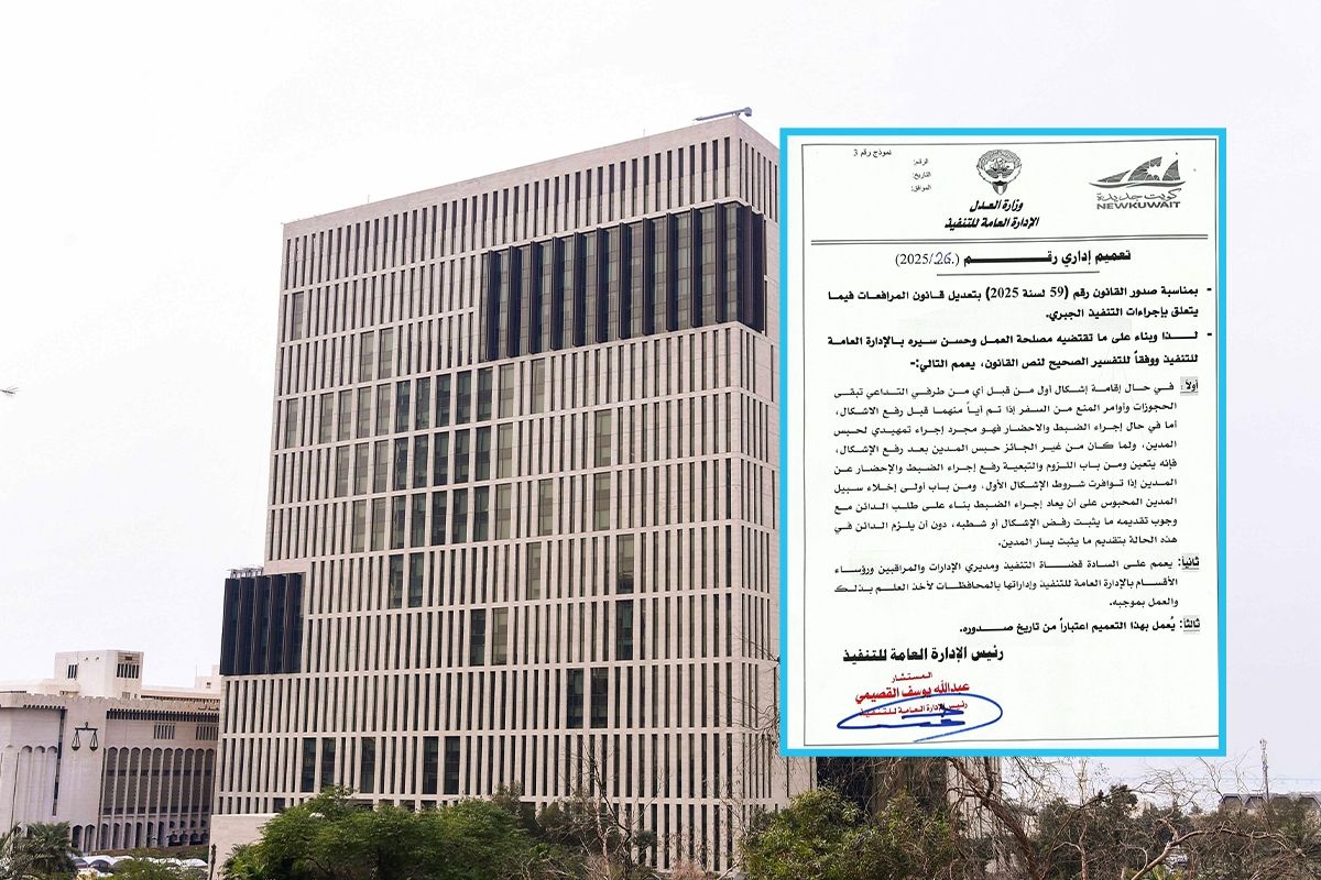 وجاء في نص التعميم الذي حصلت «الجريدة» على نسخة منه، أنه "بمناسبة صدور القانون رقم (59) لسنة (2025 بتعديل قانون المرافعات فيما يتعلق بإجراءات التنفيذ الجبري، لذا وبناء على ما تقتضيه مصلحة العمل وحسن سيره بالإدارة العامة للتنفيذ ووفقاً للتفسير الصحيح لنص القانون، فإنه «في حال إقامة إشكال أول من قبل أي من طرفي التداعي، تبقى الحجوزات وأوامر المنع من السفر، إذا تم أيا منهما قبل رفع الاشكال».