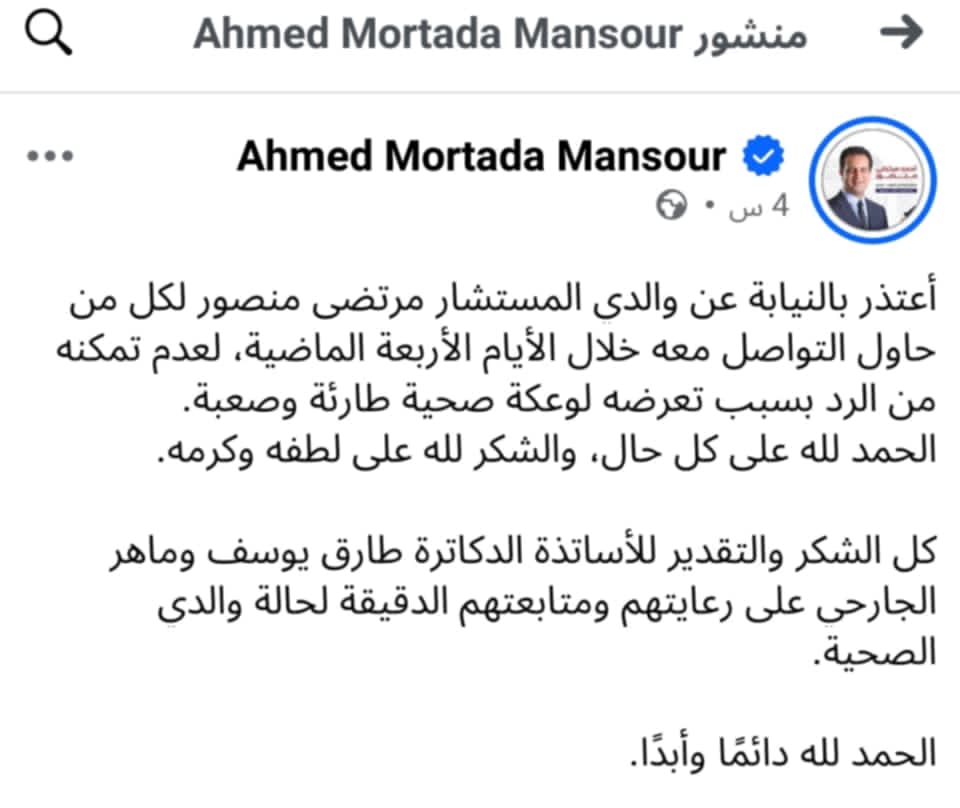 أعتذر بالنيابة عن والدي المستشار مرتضى منصور لكل من حاول التواصل معه خلال الأيام الأربعة الماضية، لعدم تمكنه من الرد بسبب تعرضه لوعكة صحية طارئة وصعبة.