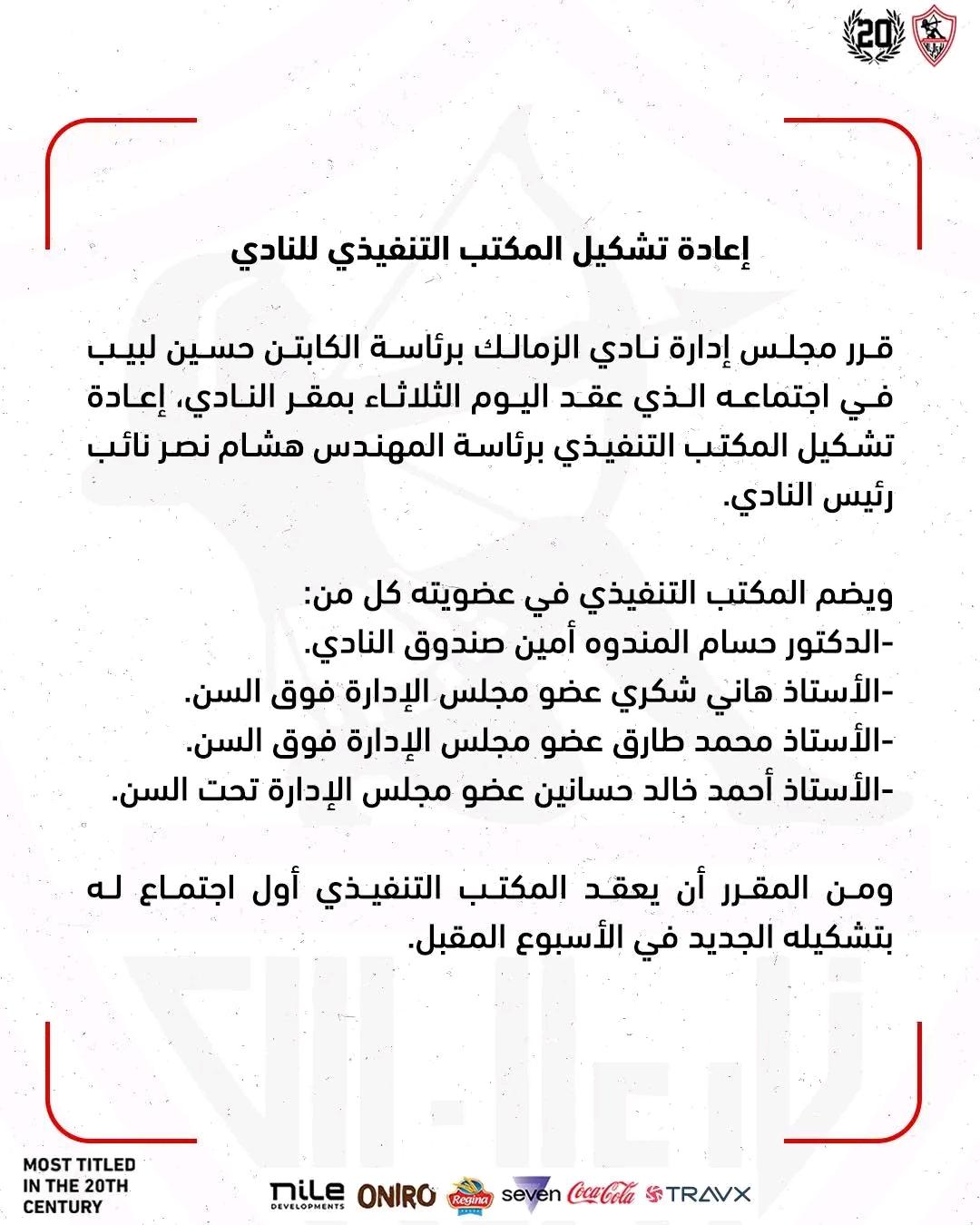 الزمالك عبر بيان رسمي أكد إعادة تشكيل المكتب التنفيذي برئاسة المهندس هشام نصر، نائب رئيس النادي.