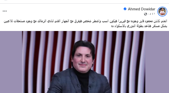 اتمني كابتن محمود فايز وجوده مع فيريرا هيكون انسب واشطر شخص هيفرق مع الجهاز الفني لنادي الزمالك مع وجود مستحقات للاعبين بشكل مستقر هناخد بطولة الدوري بالاسكواد ده