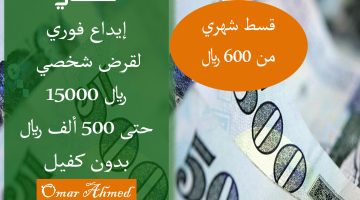 إيداع فوري.. لقرض شخصي 15000 ريال بدون كفيل وتقسيم القسط الشهري على مرتين