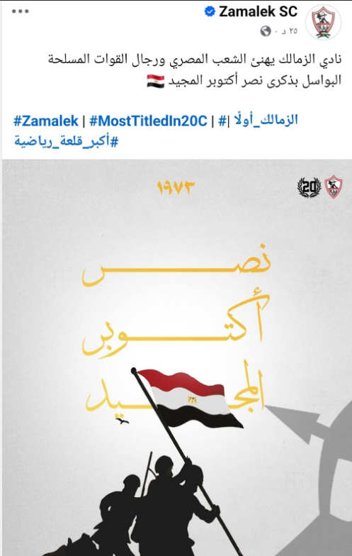 حرص نادي الزمالك على تقديم التهنئة إلى الشعب المصري بمناسبة الذكرى الـ52 لانتصارات حرب أكتوبر المجيدة،.